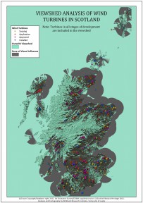 Details: The Scottish landscape is plagued by sprouting windfarm developments, which promises to increase due to recent targets of 100% sustainability by 2020, set by the Scottish National Party. In an attempt to provide greater understanding of how the windfarms affect the Scottish natural landscape, we utilize various spatial GIS tools to identify the extent of visibility of windfarms in the countryside. By identifying the extent of visibility (Map 1) of all windfarms in Scotland, we are then able to reverse engineer the viewshed to identify the lowest impact zones (Map 2) for further development.